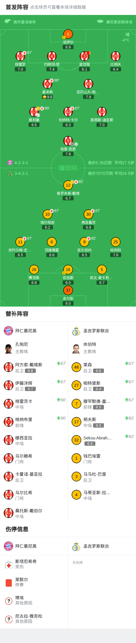 第52分钟,奥利塞开出角球,凯恩头球破门,拜仁1-0圣吉罗斯联合