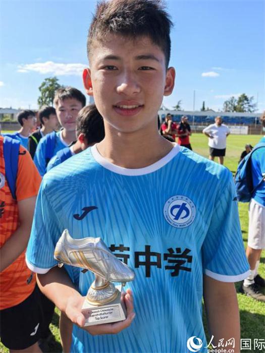 来自杭州市采荷中学足球队的张泽亨同学荣获本次邀请赛“最佳射手”称号。人民网记者 刘赫摄