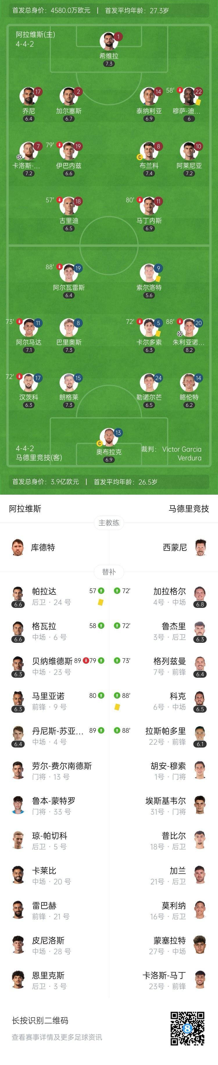 全场比赛结束,马德里竞技客场1-1战平阿拉维斯。