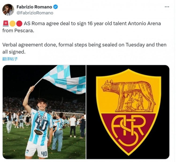 7月15日讯 据知名记者罗马诺报道,罗马引进佩斯卡拉16岁前锋阿雷纳的交易达成协议。